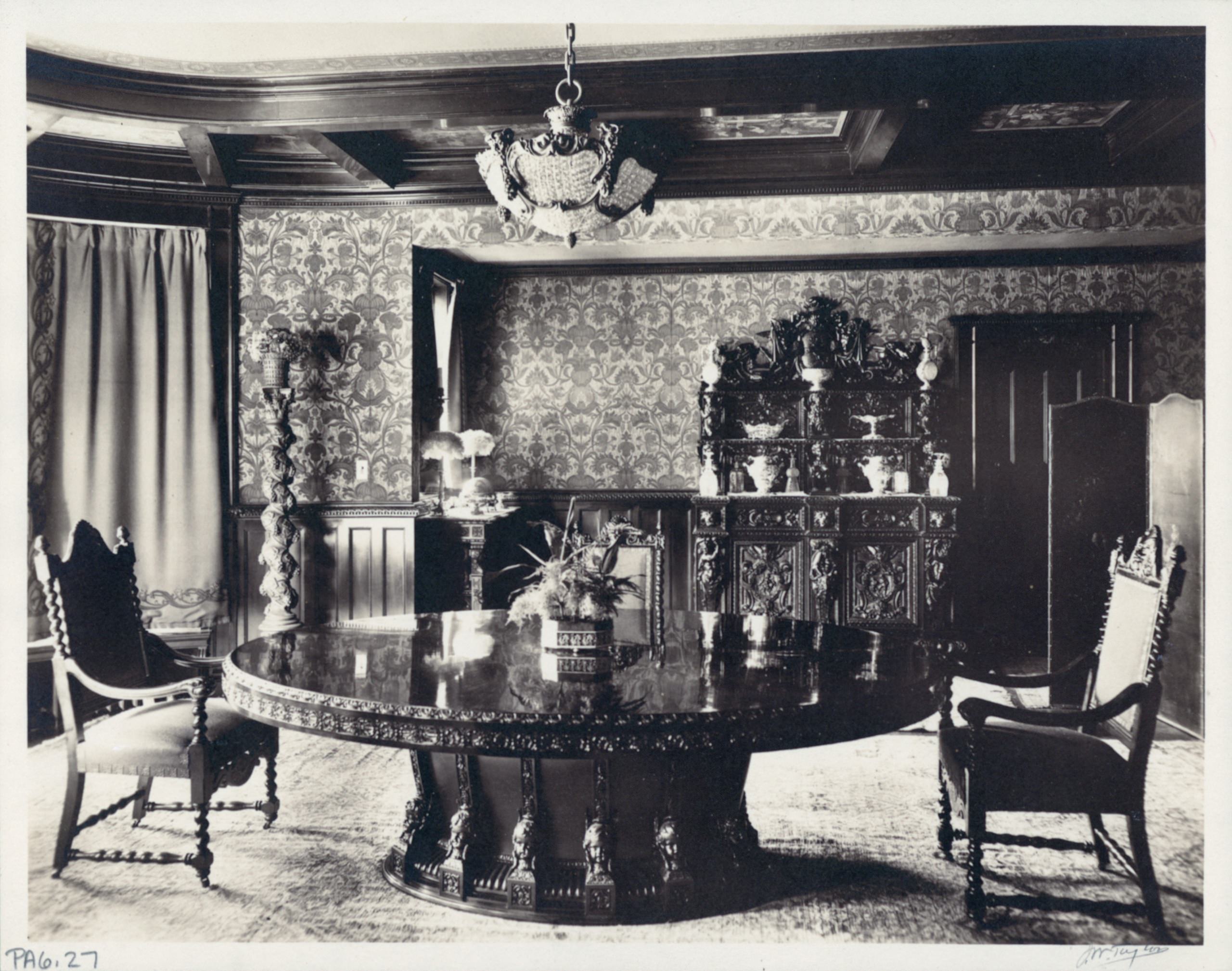 The hand-painted oil-on-canvas ceiling, depicting a lush grape arbor, testifies to the exquisite craftsmanship of the era. Designed by architect Frederick Wainwright Perkins, the hand-carved table with its mahogany construction, veneered top, and delicate fruit inlay serves as the centerpiece of the room; its cherub-adorned feet showcasing individual artistry and carving by Joseph Dux.