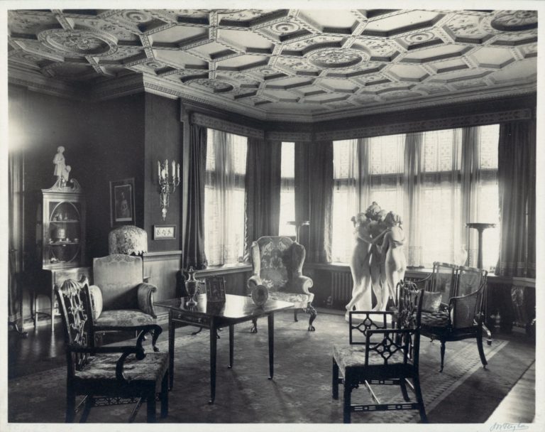 Additionally, the Drawing Room boasts the presence of "The Three Musicians of the Renaissance," a statue gifted to Mr. & Mrs. William Walter and Georgiana Vail by the Barkers as a housewarming gesture. Subsequently returned to the estate by the Walter and Vail families, this sculpture enriches the room, serving as a testament to the enduring connections between families and their shared appreciation for art and craftsmanship.