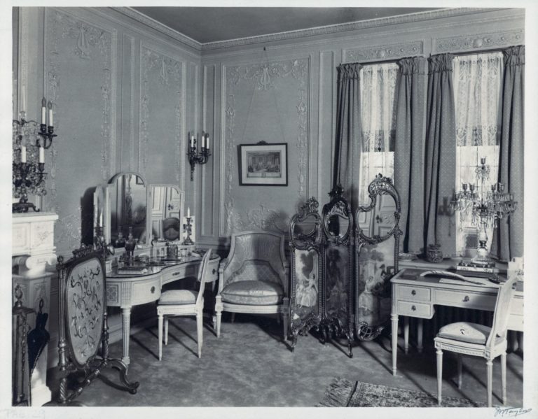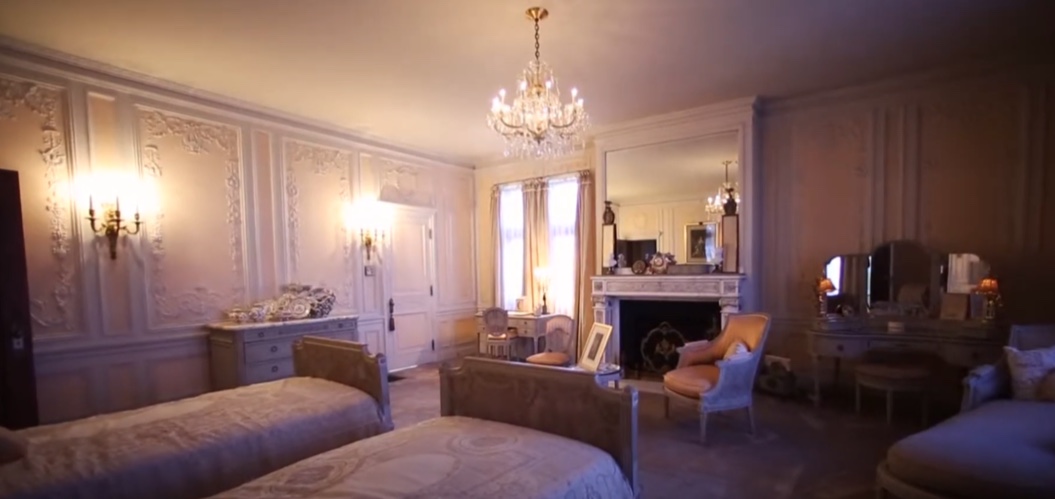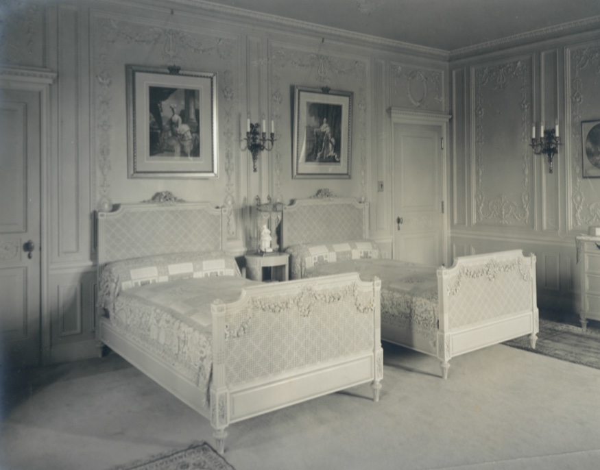Furnishings in the French Room are inspired by Louis XVI, with portraits of the monarch and Marie Antoinette hung above the twin beds. A resplendent white marble fireplace serves as a focal point of the room, illuminated by gilt bronze wall sconces from E.F. Caldwell & Co. It is noteworthy that this room stands as the sole space within the mansion featuring wall-to-wall carpeting, in keeping with its original décor.