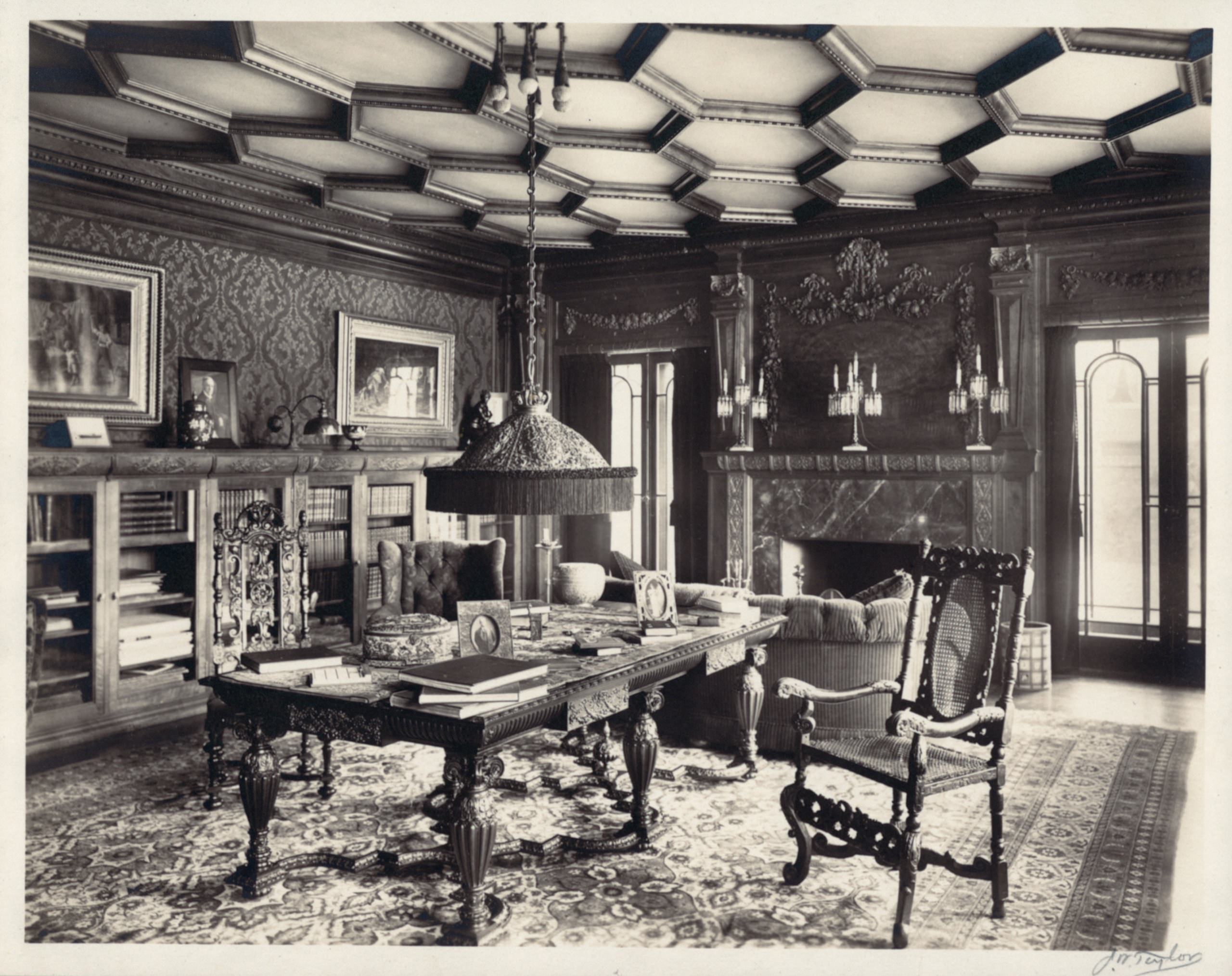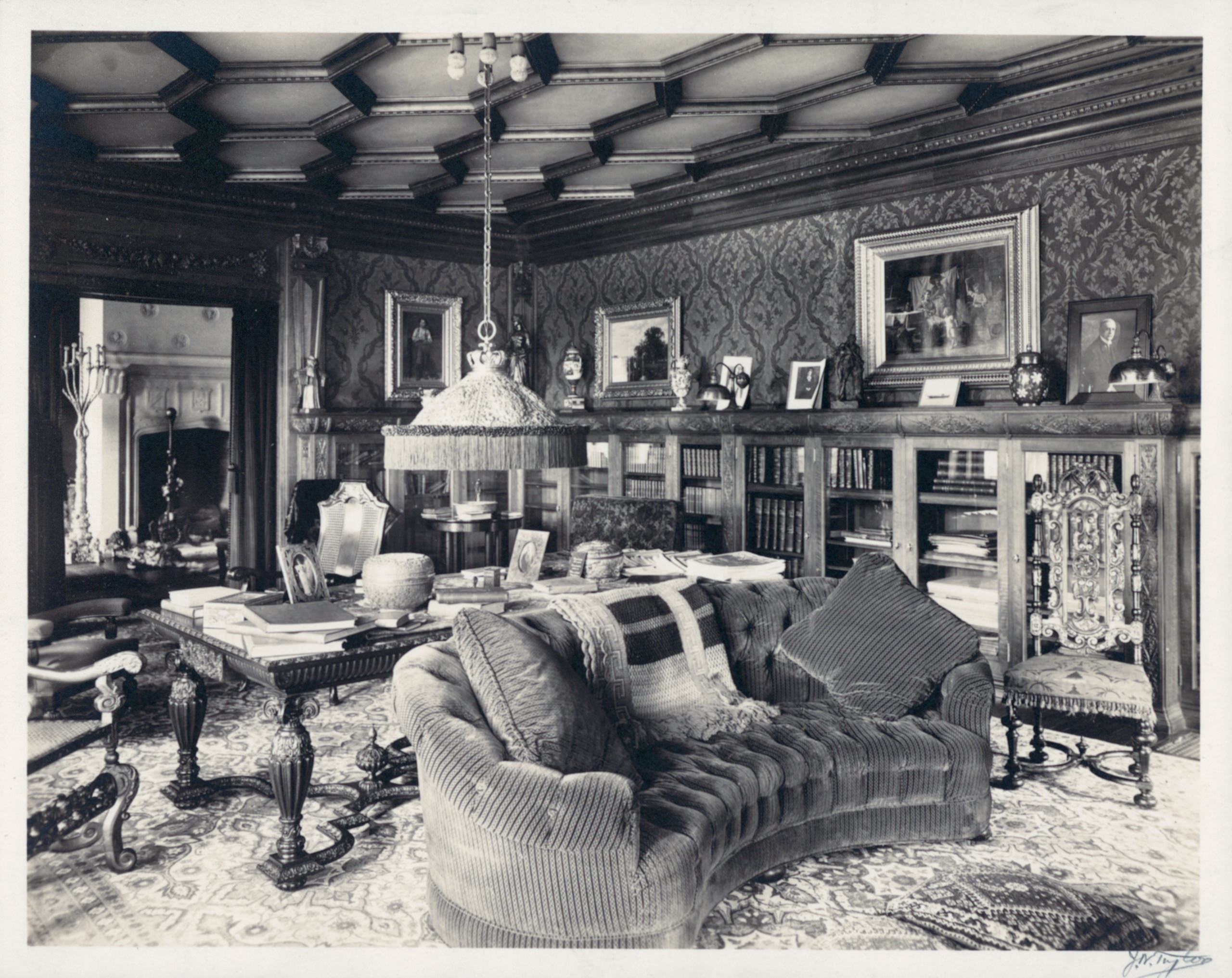 This room holds a special significance in the Barker household, serving as the favored venue for Mr. Barker's gatherings with friends and business associates. It was here, amidst the warmth of the fireplace and the comforting aroma of cigars, that lively games of cards, particularly bridge, would unfold. Take note of the exquisite bronze ashtray crafted by the renowned Tiffany Studios of New York, adding an air of elegance to the space.